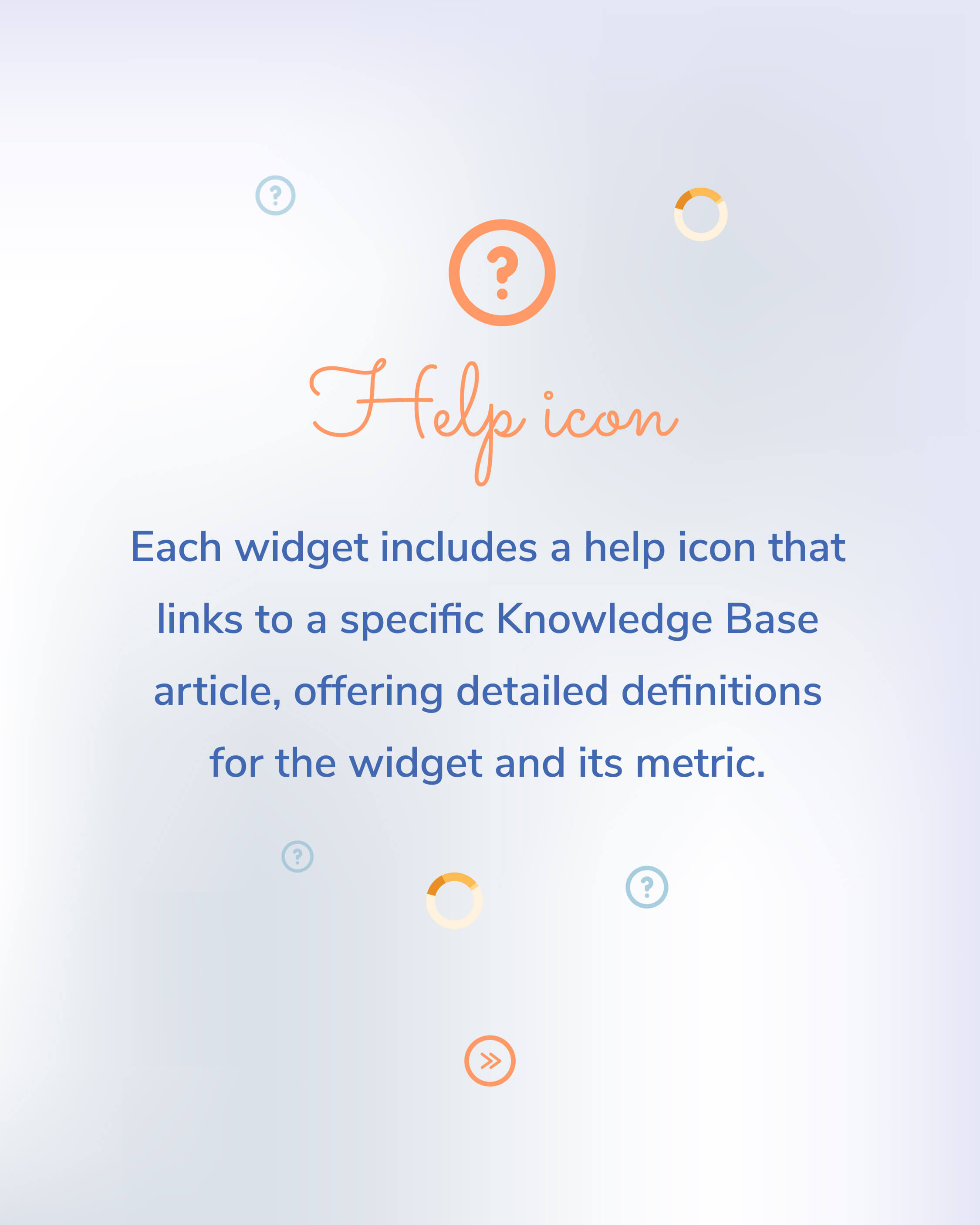 Each widget features a help button in the top right corner, linking to the Knowledge Base for more details on metric calculations.