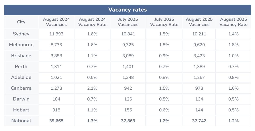 Australia’s rental vacancy rate didn’t budge in August, sitting at 1.2%, according to the latest data from SQM Research. There were 37,742 vacant properties across the country, only 121 fewer than in July. It paints a fairly steady picture of the market, with just small changes showing up across the capital cities. Overall, renters still face tough competition for homes in every capital city.